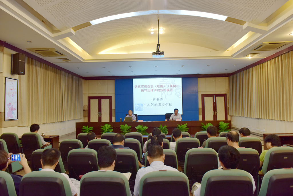 7月13日下午,中共河南省委党校副校长尹书博教授应邀来我院作题为《认真贯彻落实<准则>、<条例>做守纪律讲规矩的模范》的“两学一做”廉政辅导报告。我院副院长丁同民主持会议,全院职工参加报告会。